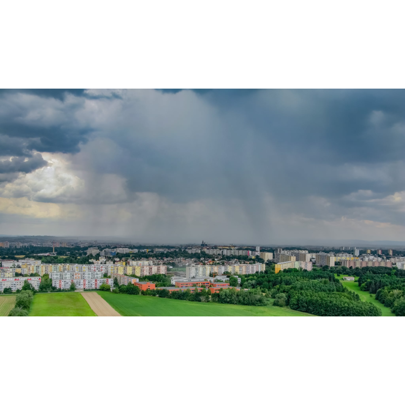 Hradec Králové s deštěm. Fotografie pořízená z vodojemu na Novém Hradci Králové