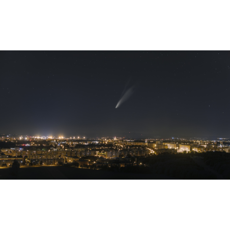 Hradec Králové s kometou Neowise. Fotografie pořízená z vodojemu na Novém Hradci Králové