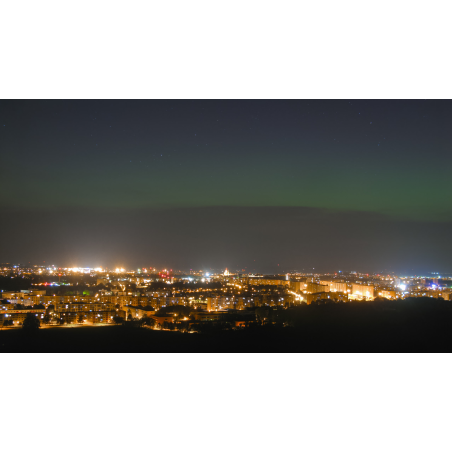 Hradec Králové a polární záře. Fotografie pořízená z vodojemu na Novém Hradci Králové